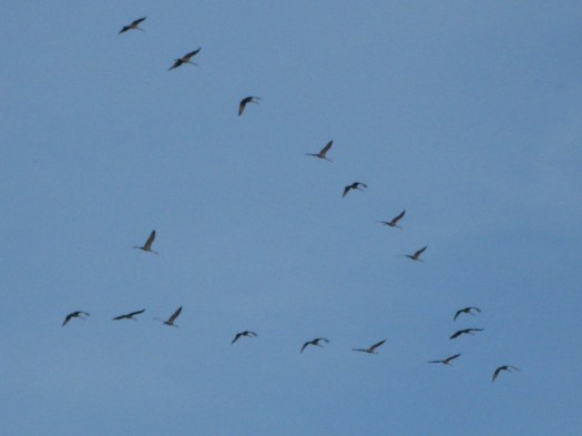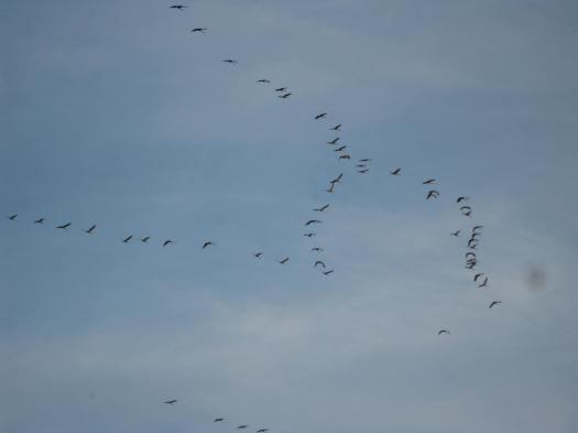 The reason that I am thinking about this, writing about this?  Maybe because I’m a genealogist or because I’m such a nature-lover, these birds are a fascination to me.  As a genealogist, I wonder whether my ancestors had the opportunity to witness such a spectacle, if their farms had these graceful birds feeding there before setting off for the south.  My Québec ancestors were farmers almost entirely (some were woodworkers) so I think about what I just saw and how ancient these birds are (I think I read somewhere they they are millions of years old, from fossil evidence!), wondering if they were part of the lives of my people in Québec.  With the St. Lawrence and other waterways in the region that my families’ farms were located (most recently, my ancestors are from Maskinongé, Québec and around both Québec City, Montréal and back into Acadia), it is certainly likely.  What did they think?  Did they stop from their farming just as I stopped from my work to look UP?