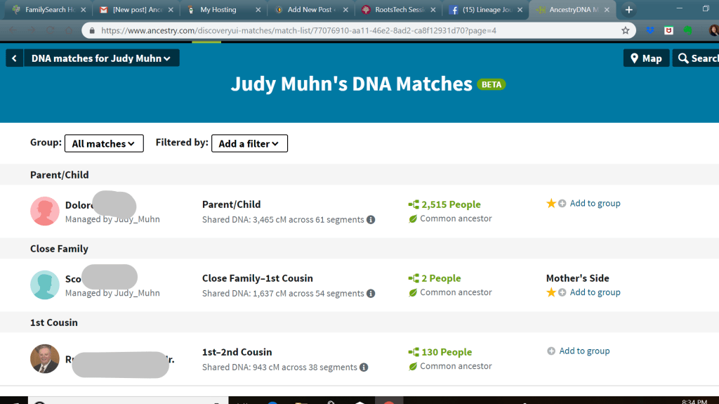 You will see the new design, color-coding, custom label options, and other new tools allowing you to sort, group, and view your DNA Matches many ways. You can create up to 24 custom family groups with custom labels (and there are some labels that they offer), assign a color and apply to your DNA Matches. Here’s a picture from my page: