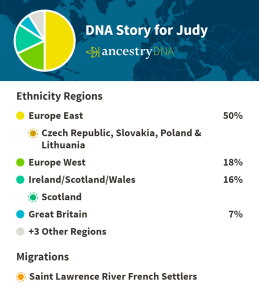 And don’t let anyone tell you what RACE you are – because they can’t! The results can tell you a bit about where geographically your ancestors traveled through on their way to where you are today. It will tell you a bit about ethnicity – the culture of our families, such as customs, favorite foods, holidays, dances and music, clothing styles, and possibly eye and hair colors. The testing information is based in finding clusters, clumps of DNA that reappear over and over again in a particular region, geography, locality in people in that area. I know, for instance, that on my mom’s side, our people were Native, French-Canadian, and Scottish because – and this is important – others with our similar DNA were from these identified groups because of records, documentation, and more. But it doesn’t tell me WHICH tribe, or WHERE in France or Scotland, or that level of detail. At least yet …. as more and more people are tested and can document specifics about these ancestors, we can begin to narrow down migratory trails, immigration routes and track back into time.
